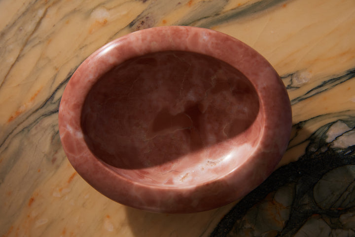 Hand-carved from richly veined Koi marble, each petite cup is polished to a satin glow and finished with a sculptural sphere handle that keeps fingertips cool. The matte warmth of the vessel perches on a softly honed marble saucer, creating a quiet dialogue of tone and texture.