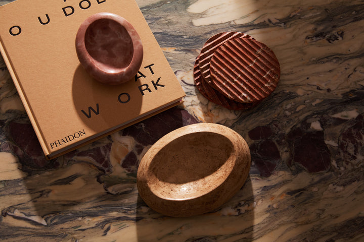 Carved from a single slab of richly veined marble, this sculptural rest cradles coffee spoons or small ladles between pours, saving linens from stray drips while adding a quiet note of luxury to the tray. Its softened silhouette echoes the form of a vintage serving spoon—an understated tribute to Tania’s heirloom collection—and sits weightily in the hand before settling flush on the table.