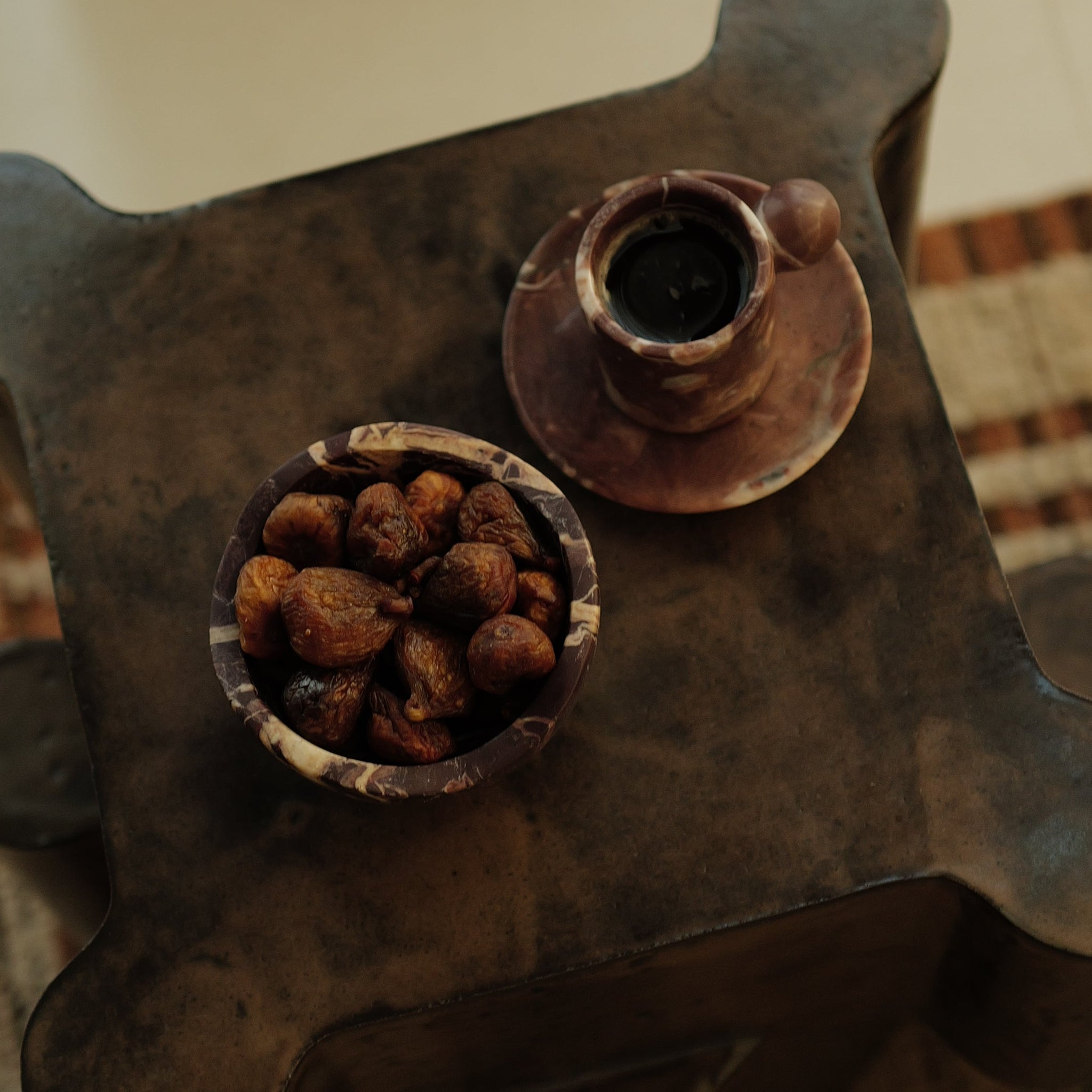 Carved from a single block of richly veined Cherry Gold marble, this petite pedestal bowl is scaled for a handful of Medjool dates, olives, or sea salt. Its gently undulating rim recalls the soft folds of desert dunes, while a slender foot lifts the vessel with quiet ceremony—perfect on a coffee tray, vanity, or bedside table.