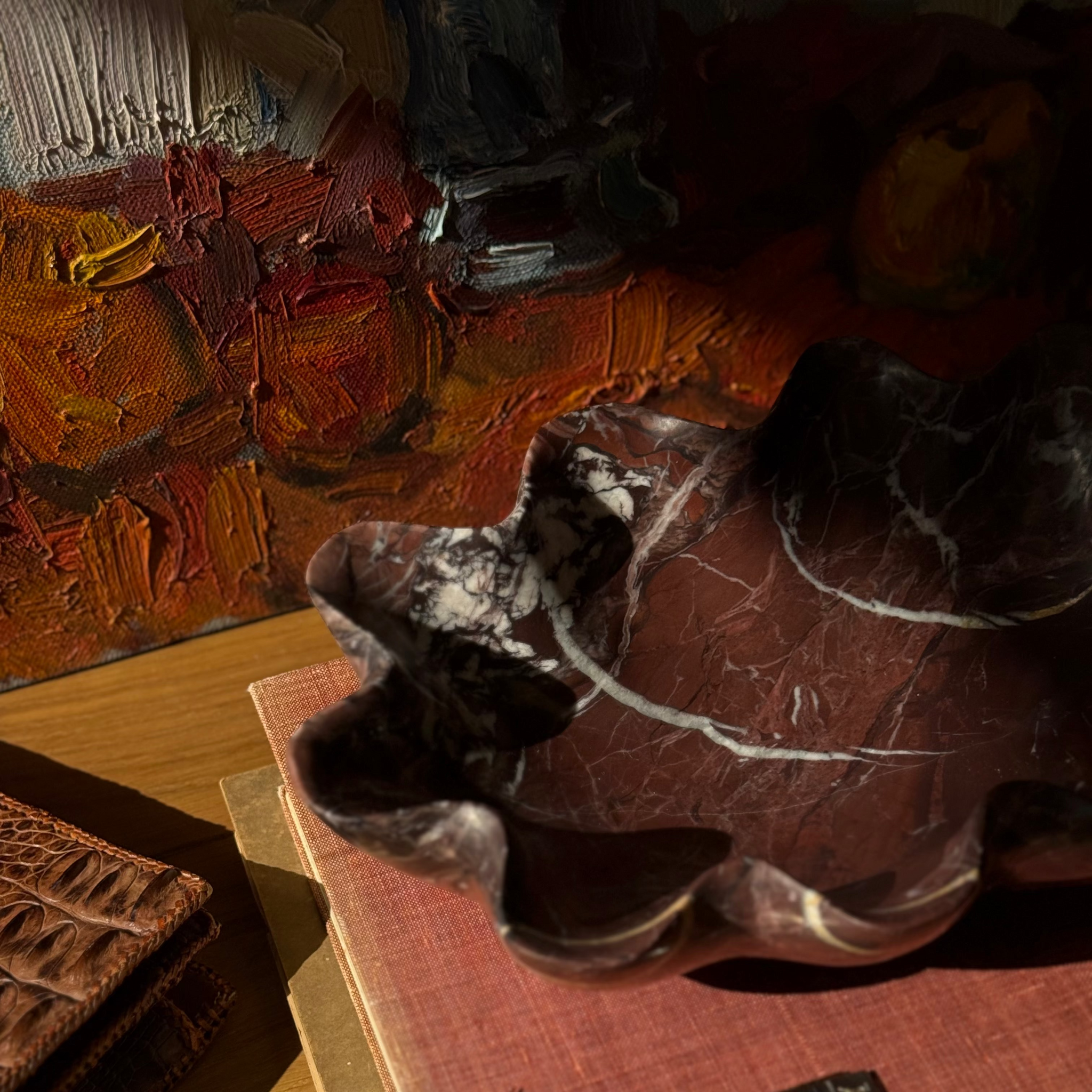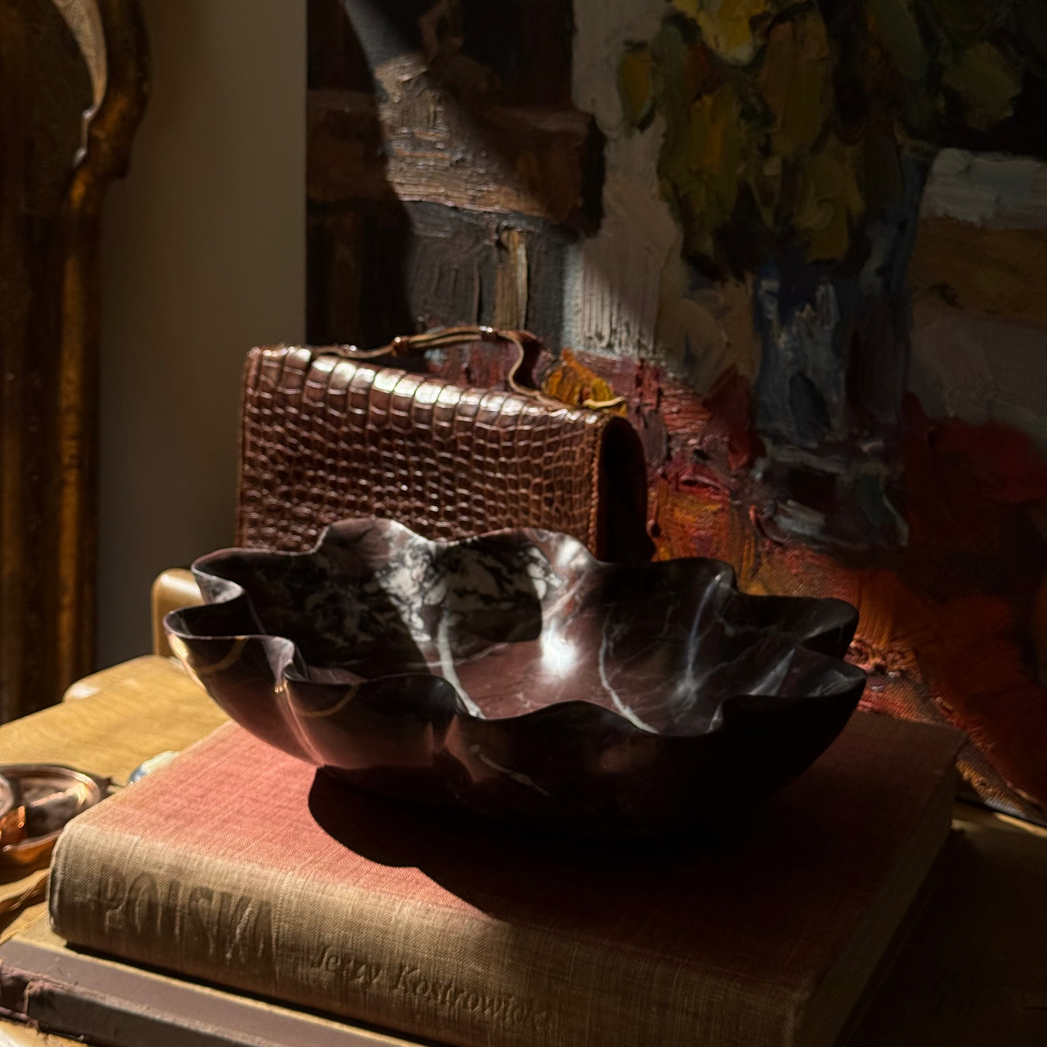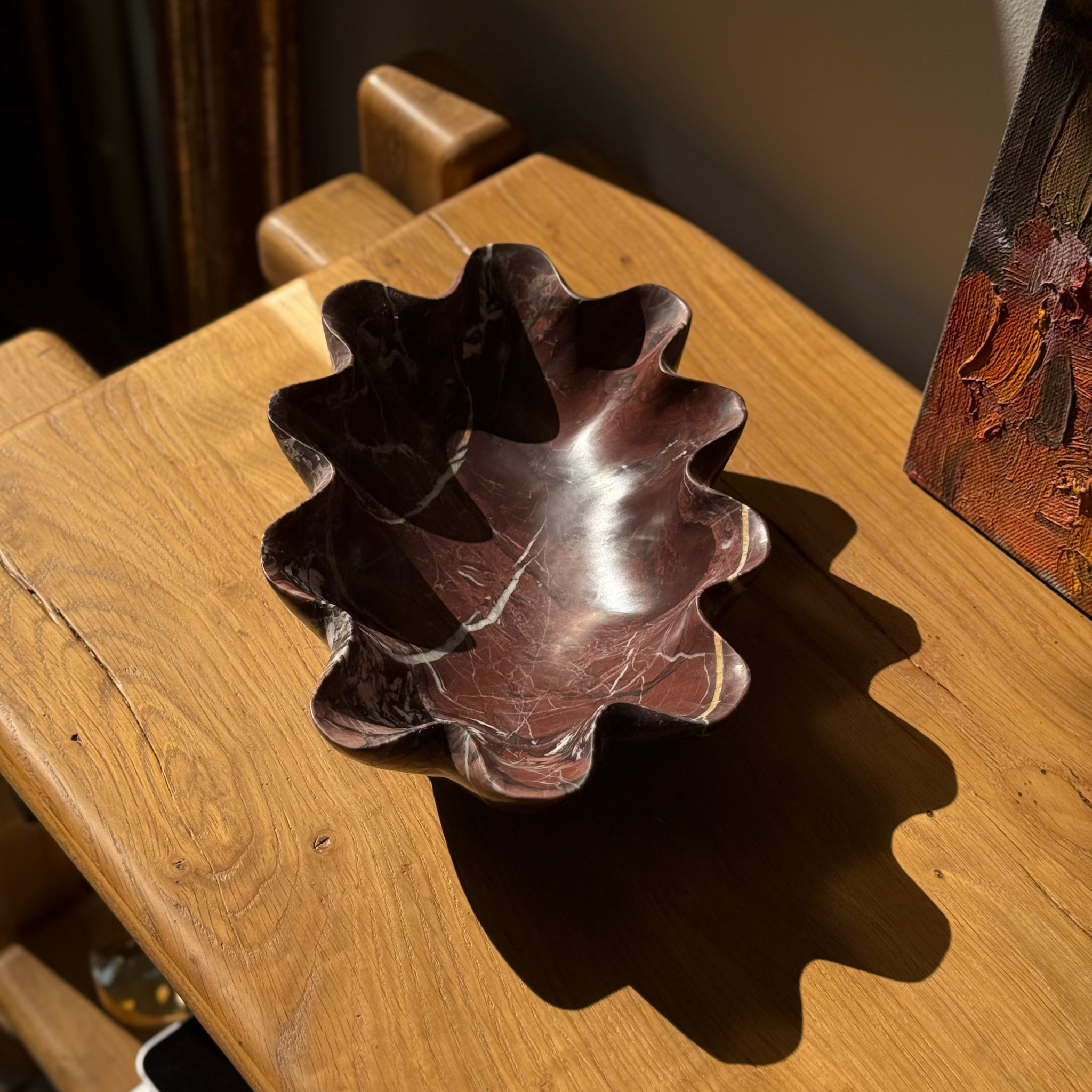 Made from a single block of marble, its undulating rim catches light and shadow in rhythm, giving the bowl a sense of movement even at rest. At 10″ across, it’s sized for fruit at the table, blooms floating in water, or simply to stand on its own as sculptural centerpiece.