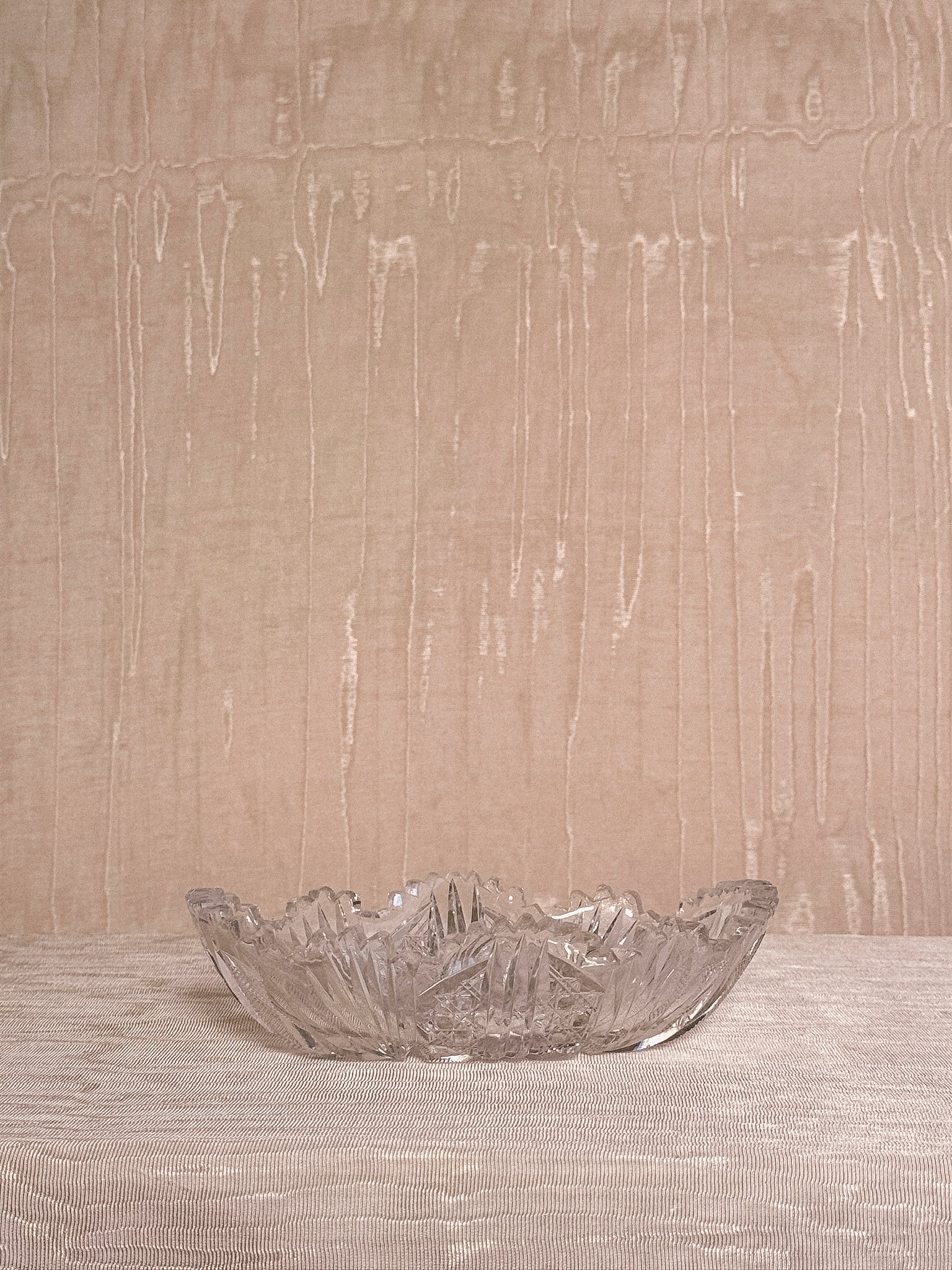 A low, shallow oval crystal dish with deeply cut star motifs at the base and bold fan cuts rising up the sides, finished with a jagged, crown-like rim. More sculptural than functional — though it handles both with ease. Small enough to tuck on a vanity and sharp enough to command it.